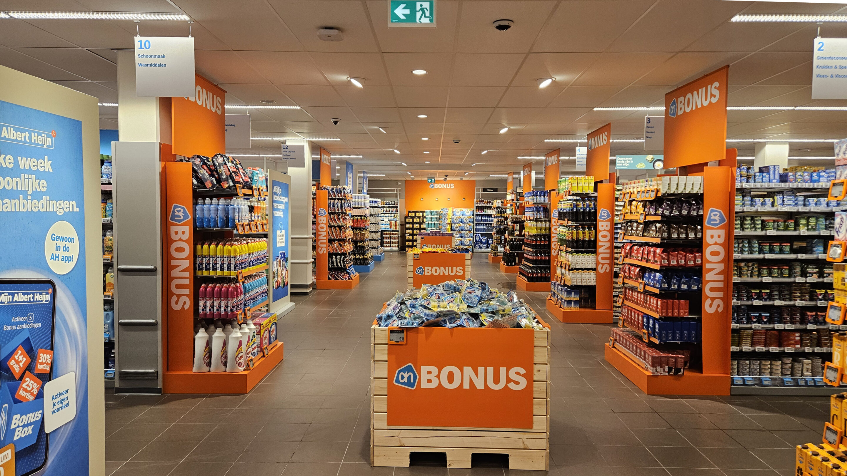 Na binnenkomst komt de klant direct op het versplein, met daarachter de borrelhoek. De broodafdeling is centraler gepositioneerd en een breed middenpad leidt de klant langs actiekoppen en het Altijd Laag-assortiment. Aan het einde van dit pad trekt een groot oranje vlak de aandacht naar de aanbiedingen.