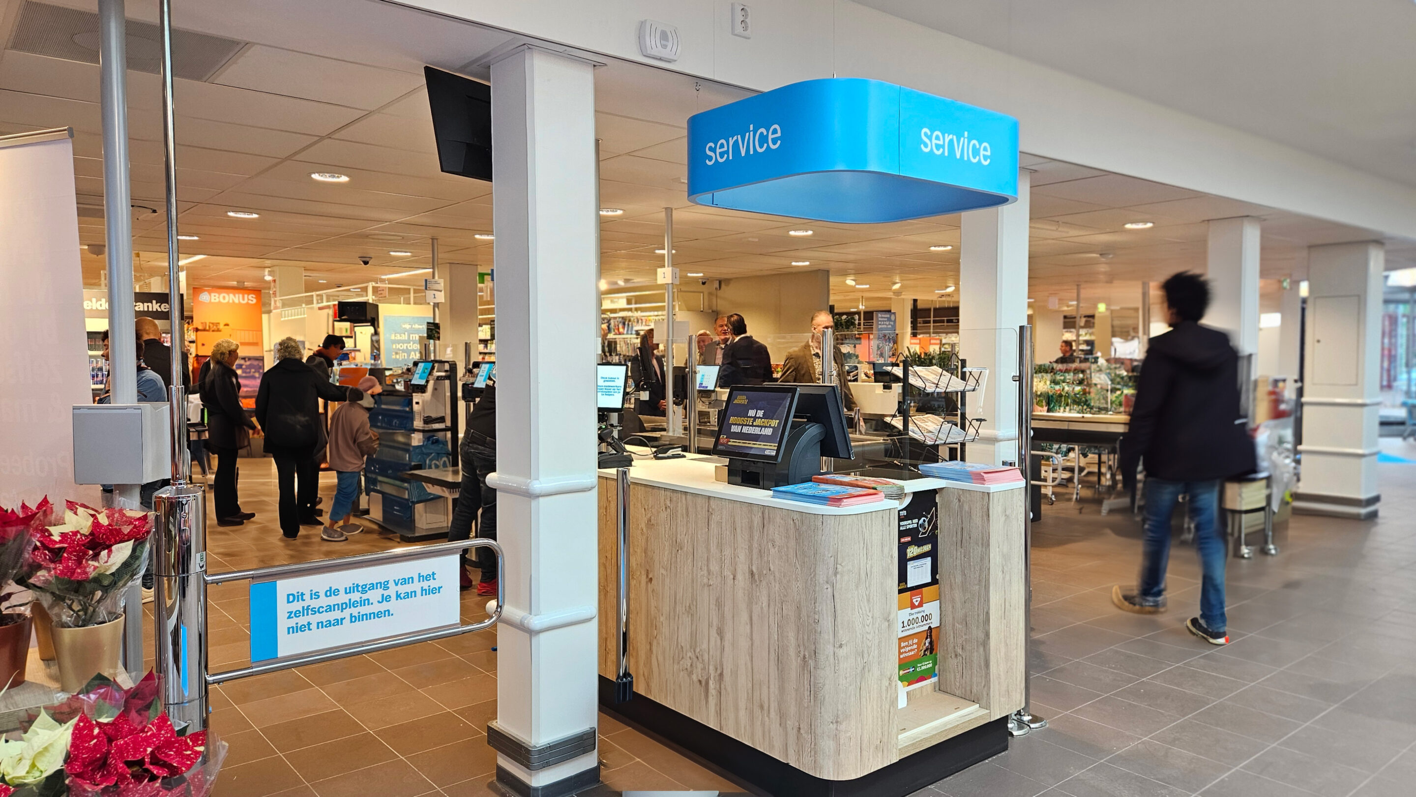 Op het serviceplein bevinden zich de servicebalie, bloemen- en plantenhoek, pakketkluis en de uitgang van het zelfscanplein. Dankzij lager meubilair en een slimme positionering van de lichtstraat valt daglicht diep de winkel in. Dit zorgt voor een open, overzichtelijke en uitnodigende entree.